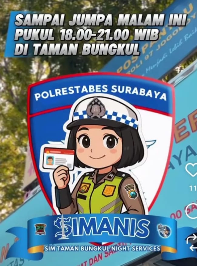 SURABAYA -Launching SIManis merupakan Inovasi pelayanan Surat Ijin Mengemudi Kendaraan Bermotor (SIM-KB), yang terkait program proses pengurusan SIM Perpanjangan di malam hari untuk warga Surabaya yang mempunyai waktu untuk perpanjangan sim di malam hari selepas kerja patut di apresiasi.