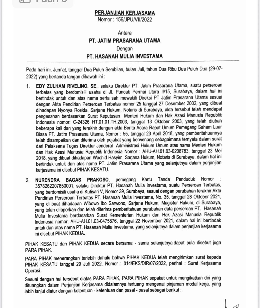 Banyak sekali perjanjian penyertaan modal dari Kas PT JPu atas pekerjaan proyek dari pihak ketiga yang akhirnya mandeg dan menjadi kredit macet.Hal ini diperparah dengan sikap cuci tangan dan lepas tanggung jawab dari Reno sebagai direktur PT JPU.